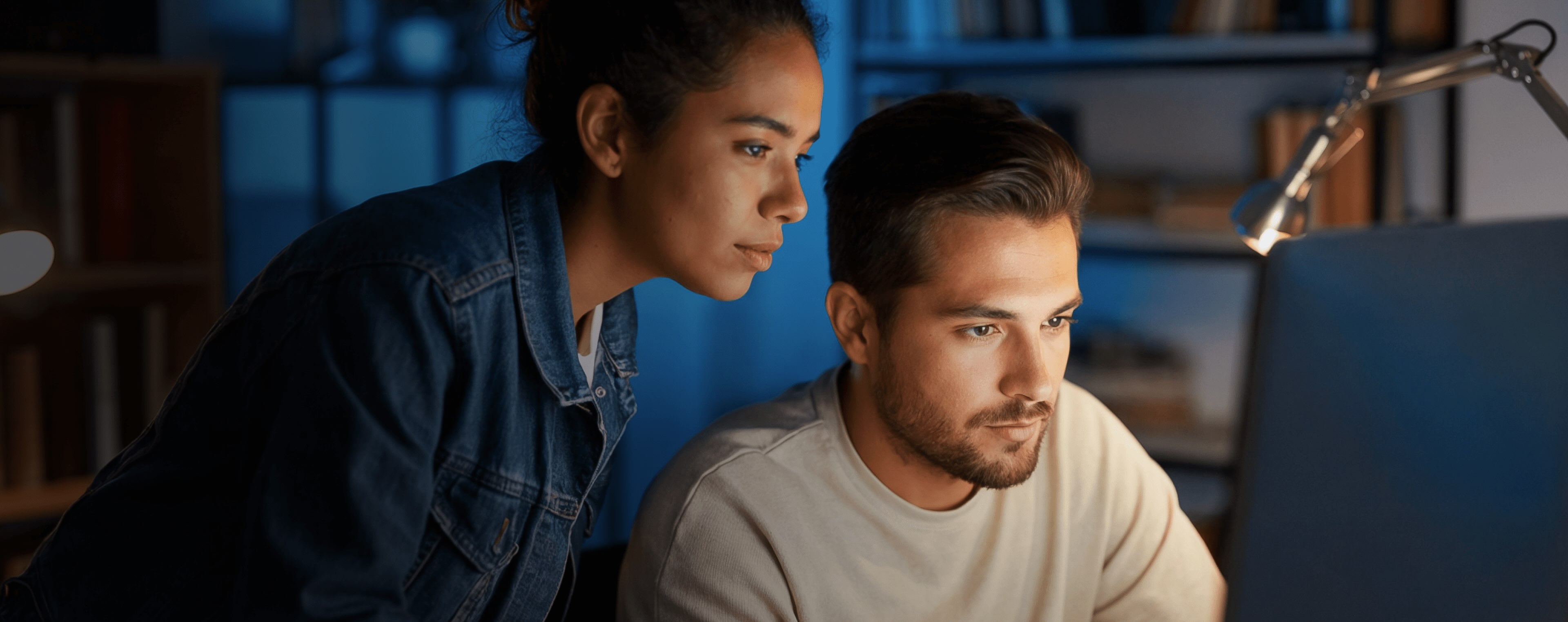 Man and woman with HP 168官方澳洲幸運5結果體彩網 laptops in an office, participating in a meeting and sharing ideas.